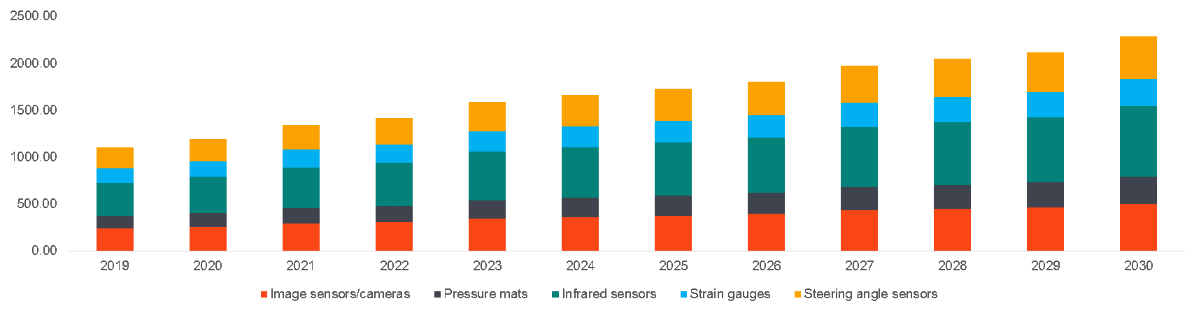 Global Automotive Driver Monitoring System includes Image sensors/cameras, Pressure mats, Infrared sensors, Strain gauges, steering angle sensor.